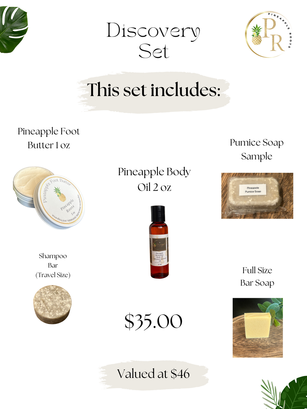 Experience the best of Pineapple Roots with our Discovery Set, a carefully curated selection of essentials designed to nourish from head to toe. This set includes a sample pumice soap, half-size shampoo bar, half-size foot butter, half-size body oil, and your choice of a full-size soap. Perfect for gifting, travel, or discovering new favorites!